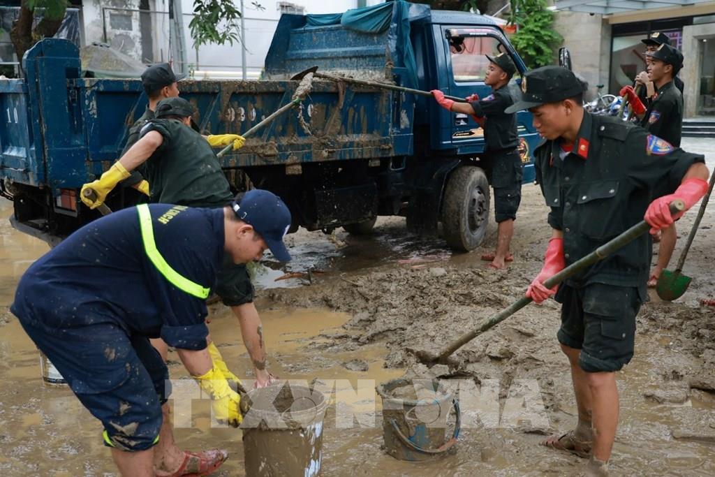 Đoàn công tác Công an tỉnh Quảng Trị có mặt tại thành phố Huế và khẩn trương tiến hành dọn vệ sinh môi trường, đẩy bùn đất tại các cơ quan, đơn vị. Ảnh: TTXVN phát