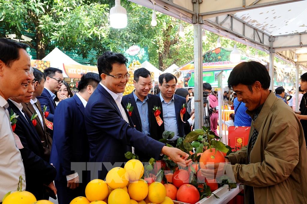 Ông Lê Quang Hòa (giữa), Phó Chủ tịch UBND tỉnh Hưng Yên tham quan gian trưng bày cam và các nông sản của tỉnh. Ảnh Mạnh Khánh-TTXVN