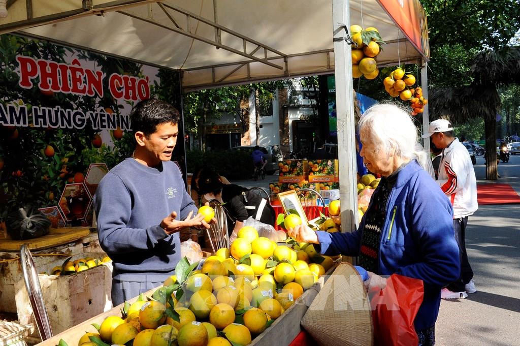 Người dân tham quan, mua sắm tại gian trưng bày cam Hưng Yên. Ảnh Mạnh Khánh-TTXVN