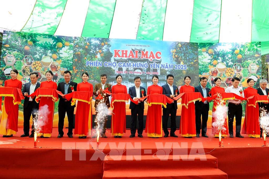 Các đại biểu thực hiện nghi thức cắt băng khai trương phiên chợ cam năm Hưng Yên năm 2025. Ảnh Mạnh Khánh-TTXVN