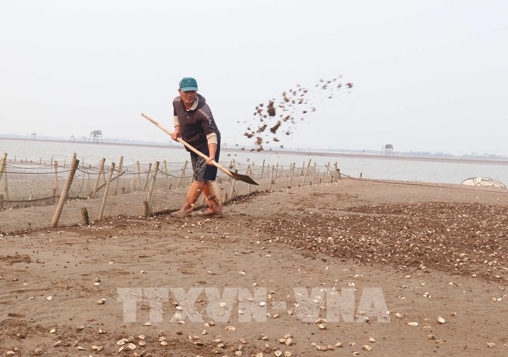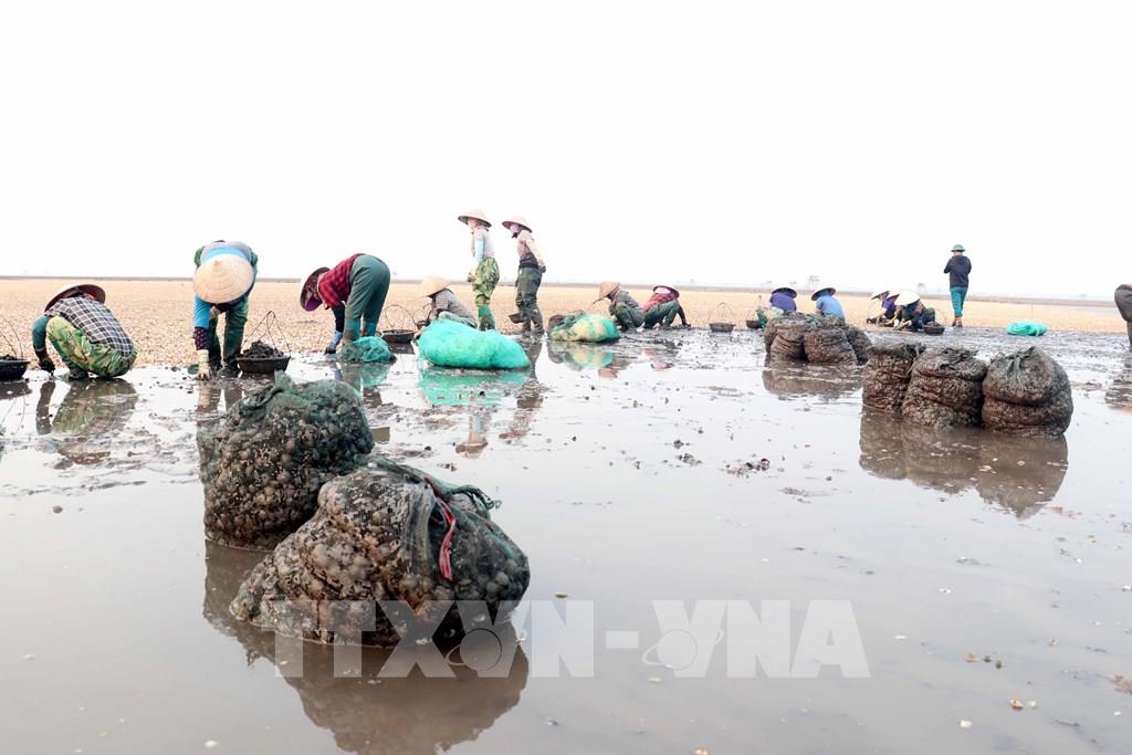 Chi phí để thu gom, dọn xác ngao, mỗi chủ bãi triều nuôi ngao dự tính mất hàng trăm triệu đồng. Ảnh: Nguyễn Công Hải - TTXVN