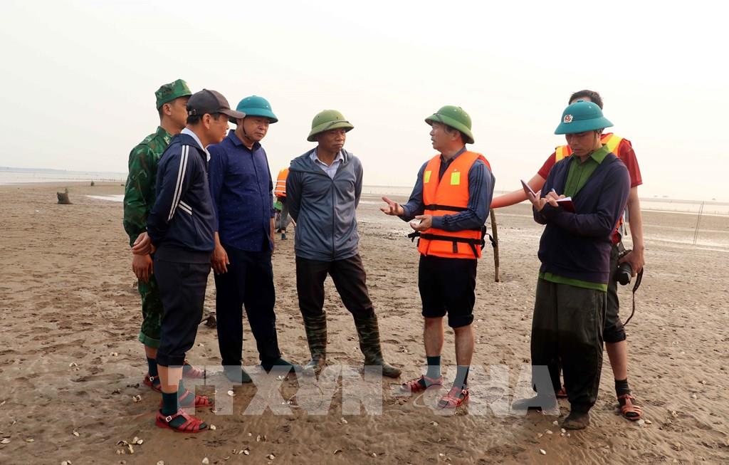 Đoàn công tác của xã Nam Cường kiểm tra thực tế tại những bãi triều nuôi ngao có hiện tượng ngao chết hàng loạt. Ảnh: Nguyễn Công Hải - TTXVN