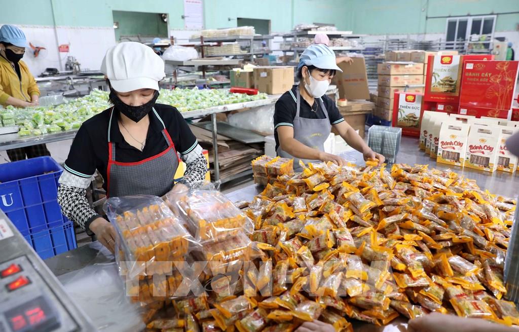 Công ty sản xuất bánh kẹo Thiên Đức (xã Đông Hưng, tỉnh Hưng Yên) tăng cường sản xuất các sản phẩm bánh cáy (sản phẩm OCOP 4 sao) để phục vụ Hội chợ Mùa thu. Ảnh: Thế Duyệt – TTXVN