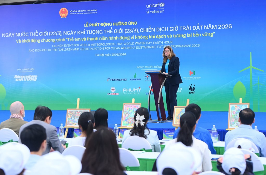 Sáng 21/3 tại Hà Nội, Bộ Nông nghiệp và Môi trường, Quỹ Nhi đồng Liên hợp quốc (UNICEF) tại Việt Nam đã phối hợp tổ chức Lễ Phát động hưởng ứng Ngày Nước thế giới (22/3), Ngày Khí tượng thế giới (23/3), Chiến dịch Giờ Trái đất năm 2026 và Khởi động chương trình "Trẻ em và Thanh niên hành động vì Không khí sạch và Tương lai bền vững".