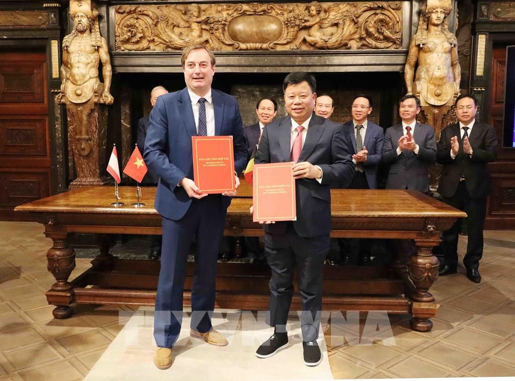 Ông Bruno Jaspaert, Tổng giám đốc Tổ hợp KCN DEEP C và ông Lê Trung Kiên, Phó chủ tịch UBND TP. Hải Phòng trao Biên bản ghi nhớ hợp tác giữa hai bên tại Hội nghị xúc tiến đầu tư. Ảnh: Hương Giang - PV TTXVN tại Bỉ