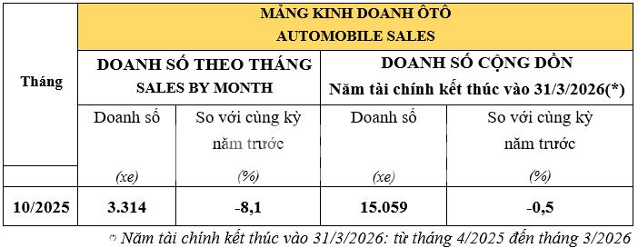 Ở lĩnh vực ô tô, Honda Việt Nam ghi nhận doanh số 3.314 xe trong tháng 10/2025, giảm 8,1% so với cùng kỳ năm 2024. Lũy kế từ đầu năm tài chính đến hết tháng 10/2025, tổng doanh số mảng ô tô đạt 15.059 xe, giảm nhẹ 0,5% so với cùng kỳ năm trước.