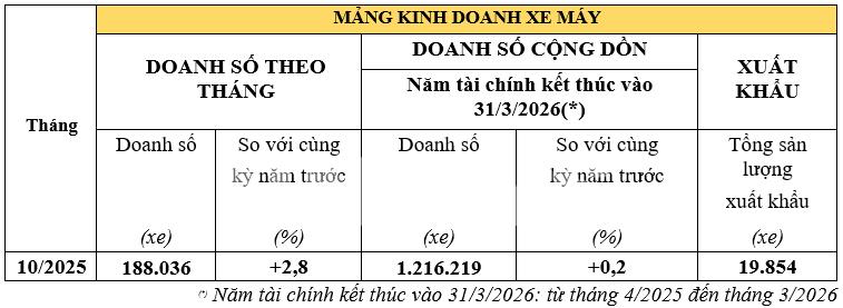 Tính từ đầu năm tài chính 2025, bắt đầu từ tháng 4/2025 đến hết tháng 10/2025, tổng doanh số cộng dồn đạt 1.216.219 xe, tăng nhẹ 0,2% so với cùng kỳ năm tài chính trước.