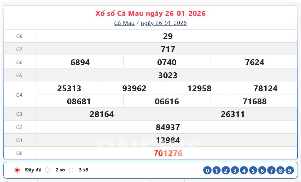 Bnews. XSCM. Kết quả xổ số hôm nay ngày 26/1. XSCM Thứ Hai. Trực tiếp KQXSCM ngày 26/1. Kết quả xổ số Cà Mau hôm nay ngày 26/1/2026. Kết quả xổ số Cà Mau Thứ Hai ngày 26/1/2026.