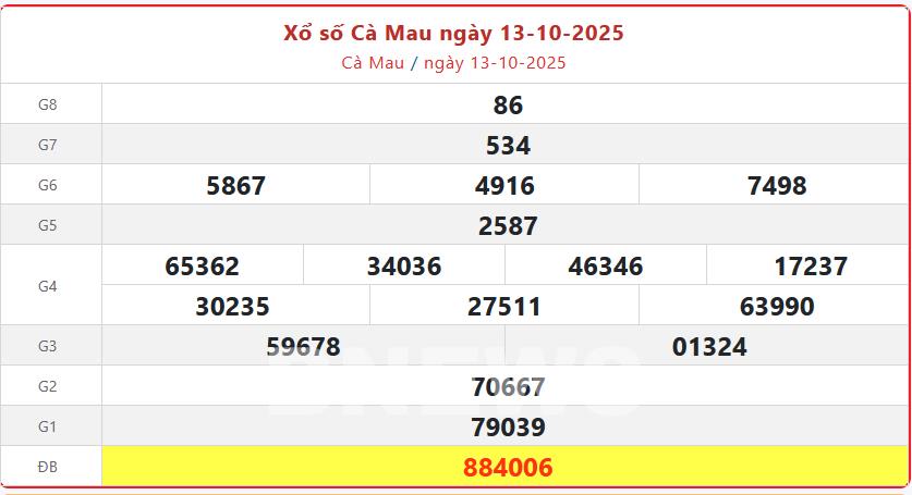 Kết quả xổ số Cà Mau Thứ Hai ngày 13/10/2025