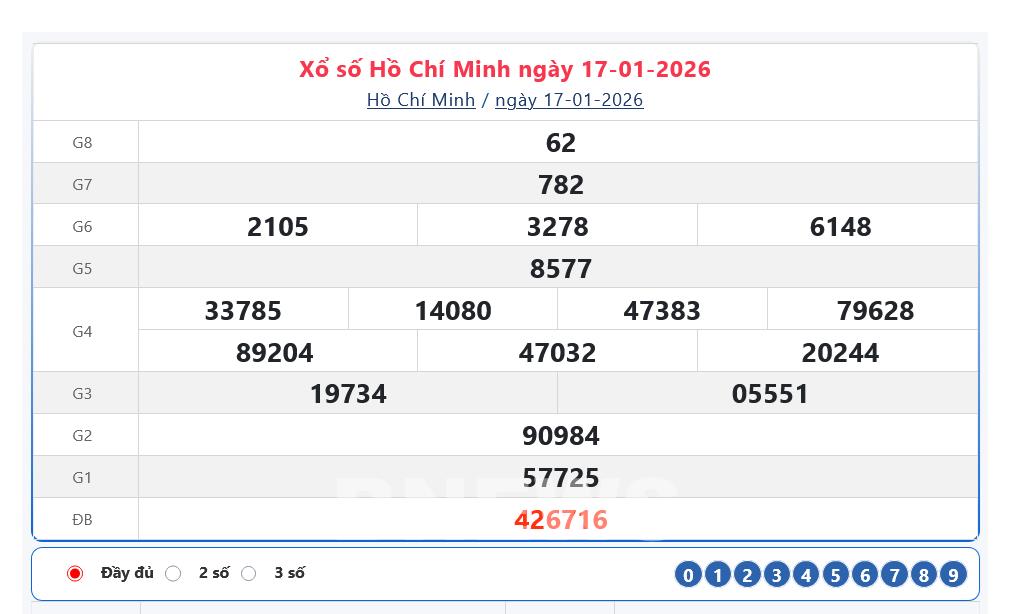 Kết quả xổ số TP. Hồ Chí Minh Thứ Bảy ngày 17/1/2026