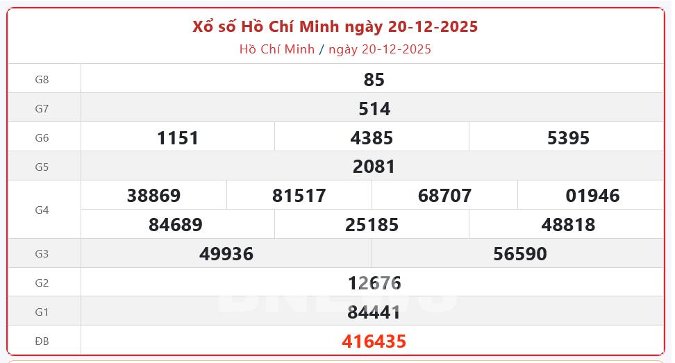 Kết quả xổ số TP. Hồ Chí Minh Thứ Bảy ngày 20/12/2025