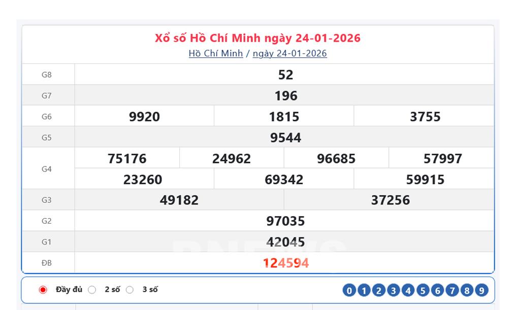 Kết quả xổ số TP. Hồ Chí Minh Thứ Bảy ngày 24/1/2026