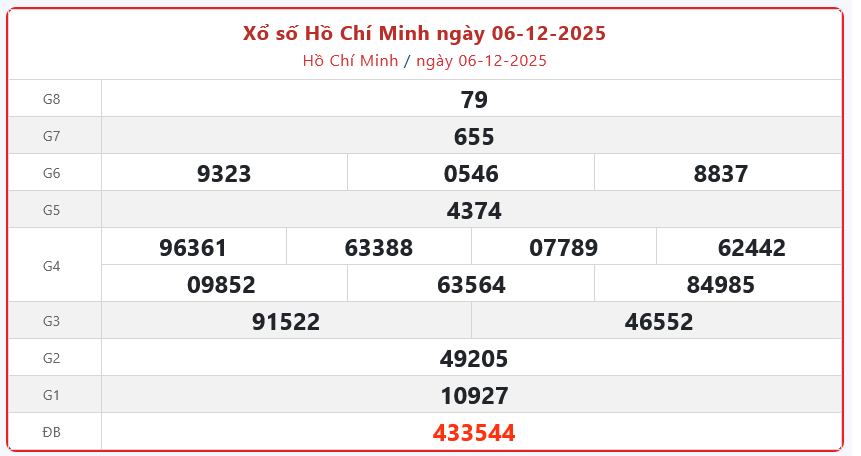 Kết quả xổ số TP. Hồ Chí Minh Thứ Bảy ngày 6/12/2025