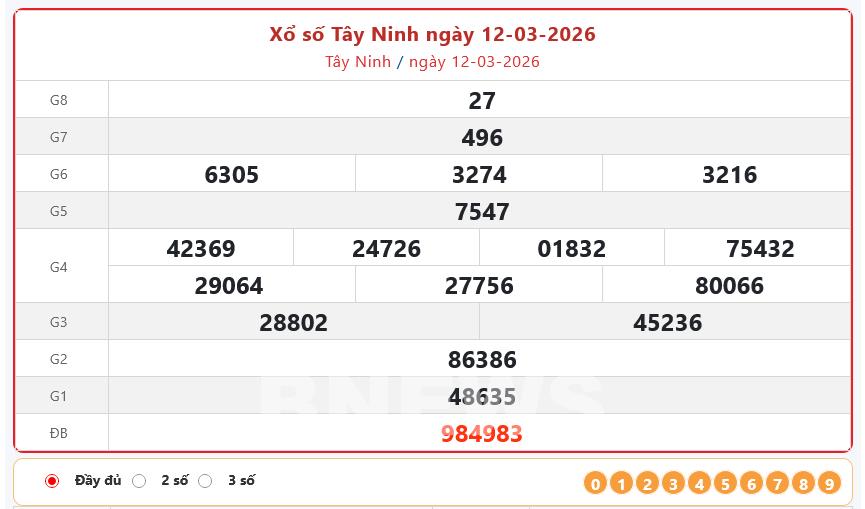 Kết quả xổ số Tây Ninh Thứ Năm ngày 12/3/2026
