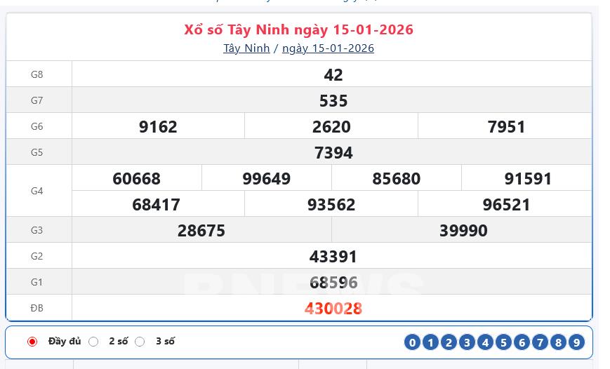 Bnews. XSTN 15/1. Kết quả xổ số hôm nay ngày 15/1. XSTN Thứ Năm. Trực tiếp KQXSTN ngày 15/1. Kết quả xổ số Tây Ninh hôm nay ngày 15/1/2026. Kết quả xổ số Tây Ninh Thứ Năm ngày 15/1/2026.