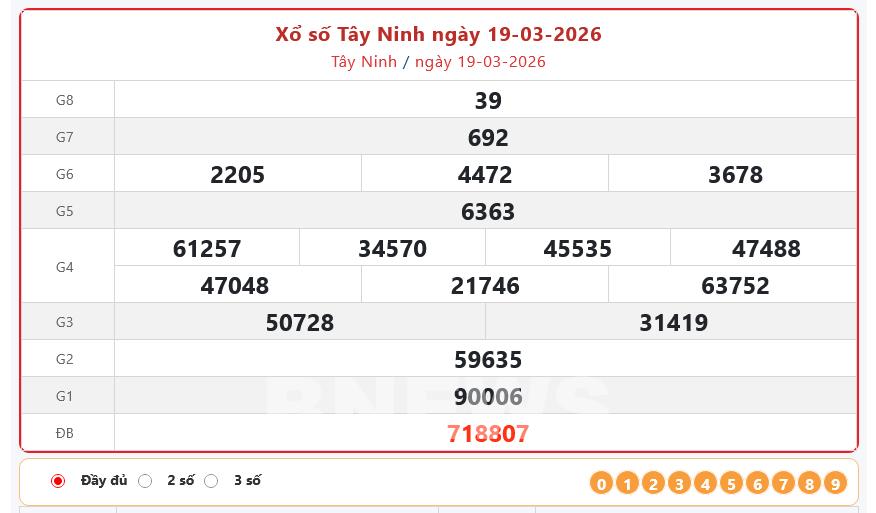 Kết quả xổ số Tây Ninh Thứ Năm ngày 19/3/2026