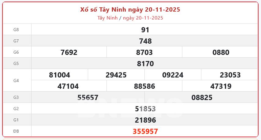 Kết quả xổ số Tây Ninh Thứ Năm ngày 20/11/2025