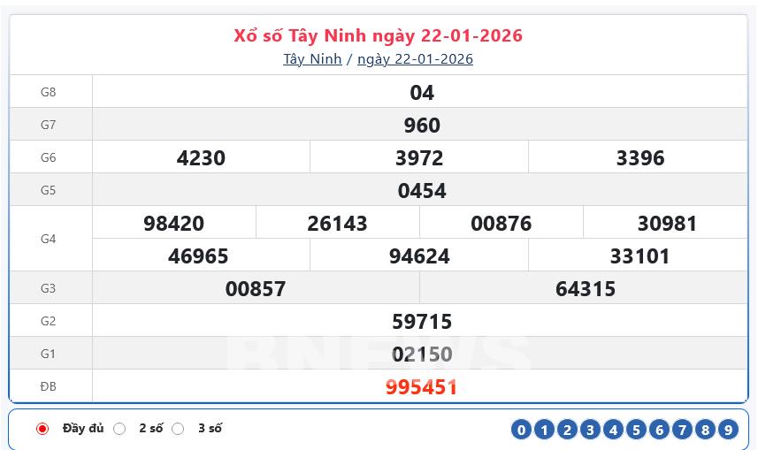 Bnews. XSTN 22/1. Kết quả xổ số hôm nay ngày 22/1. XSTN Thứ Năm. Trực tiếp KQXSTN ngày 22/1. Kết quả xổ số Tây Ninh hôm nay ngày 22/1/2026. Kết quả xổ số Tây Ninh Thứ Năm ngày 22/1/2026.