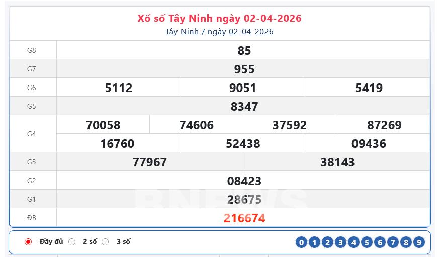 Bnews. XSTN 2/4. Kết quả xổ số hôm nay ngày 2/4. XSTN Thứ Năm. Trực tiếp KQXSTN ngày 2/4. Kết quả xổ số Tây Ninh hôm nay ngày 2/4/2026. Kết quả xổ số Tây Ninh Thứ Năm ngày 2/4/2026.