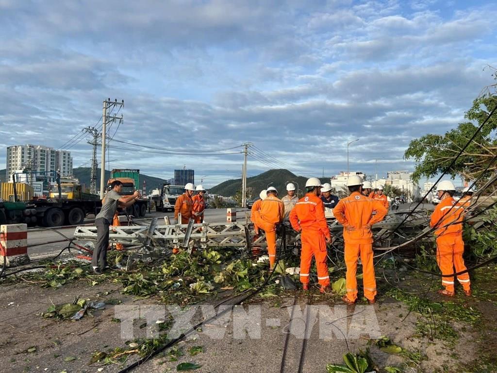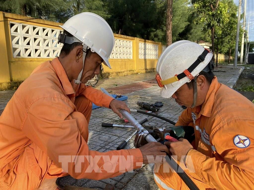 Công nhân điện lực khắc phục sự cố điện do ảnh hưởng của bão số 13 gây thiệt hại. Ảnh: Trần Lê Lâm - TTXVN