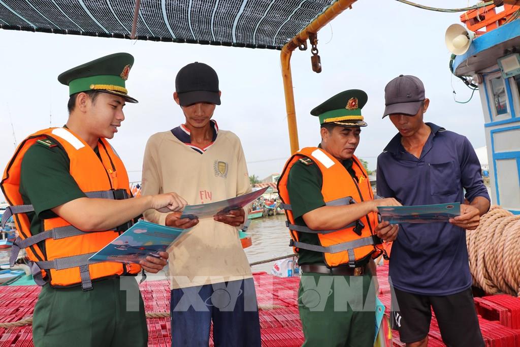 Chiến sĩ Đồn Biên phòng Long Vĩnh tuyên truyền chống khai thác IUU cho ngư dân tại Cảng cá Định An (xã Đại An, tỉnh Vĩnh Long). Ảnh: Thanh Hòa- TTXVN