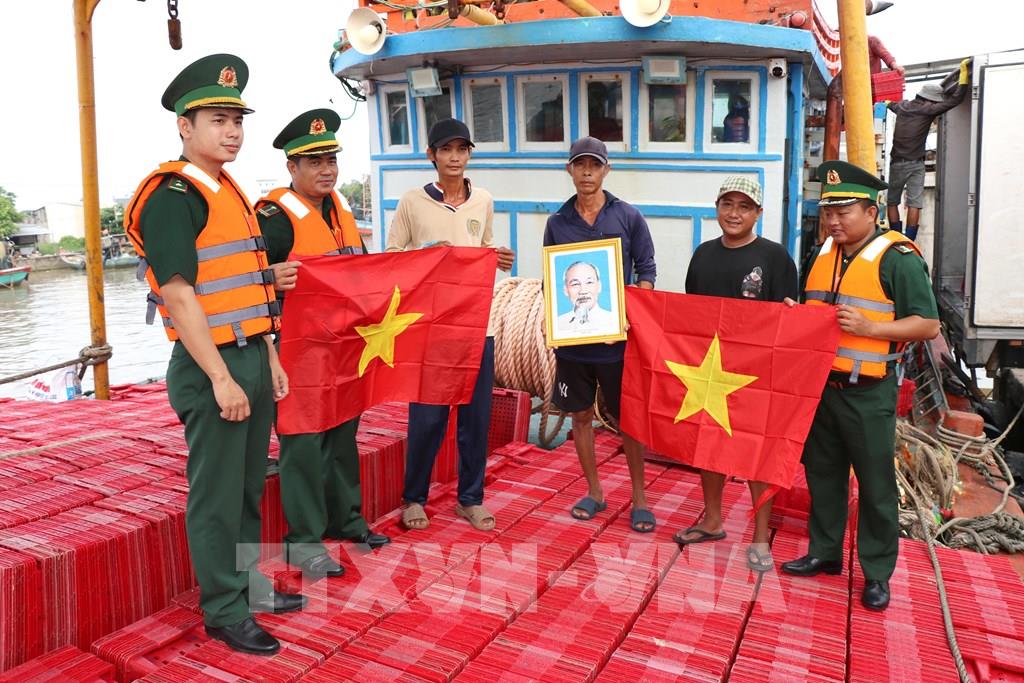 Chiến sĩ Đồn Biên phòng Long Vĩnh tặng cờ Tổ quốc và ảnh Bác Hồ cho ngư dân tại Cảng cá Định An (xã Đại An, tỉnh Vĩnh Long). Ảnh: Thanh Hòa- TTXVN