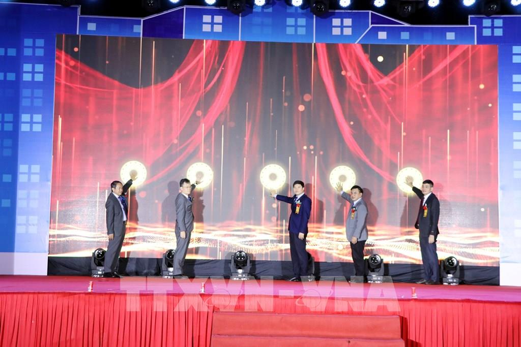 Các đại biểu bấm nút khai mạc hội chợ. Ảnh: Mạnh Tú - TTXVN