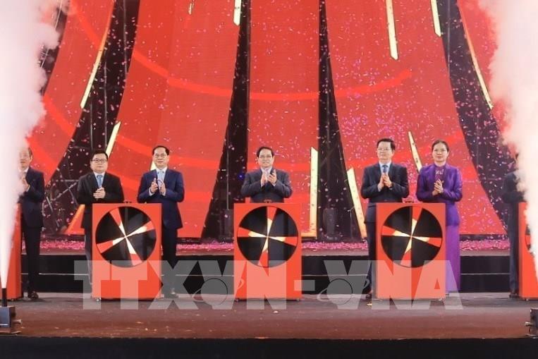 Thủ tướng Phạm Minh Chính và các đại biểu thực hiện nghi thức bấm nút khai mạc Hội chợ Mùa Xuân lần thứ nhất - năm 2026. Ảnh: Minh Quyết - TTXVN