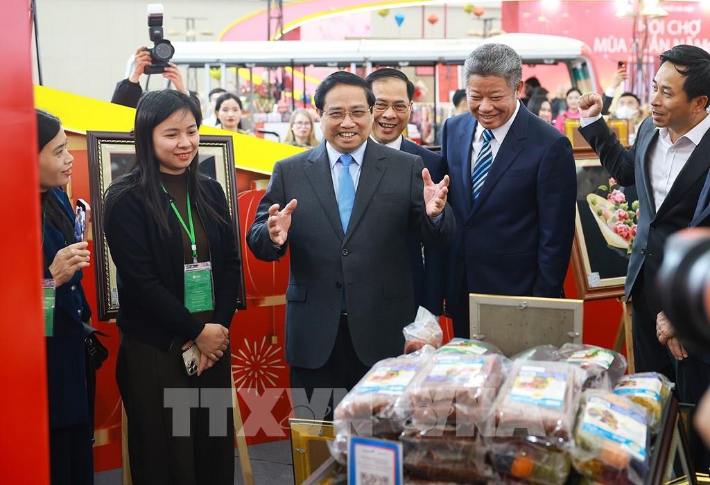 Thủ tướng Phạm Minh Chính tham quan các gian hàng tại Hội chợ Mùa Xuân lần thứ nhất - năm 2026. Ảnh: Dương Giang-TTXVN