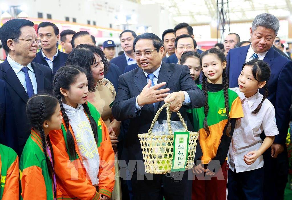 Thủ tướng Phạm Minh Chính và đại biểu tham quan các gian hàng tại Hội chợ. Ảnh: Minh Quyết - TTXVN