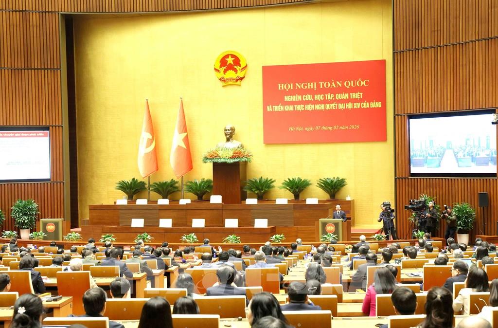 Hội nghị toàn quốc nghiên cứu, học tập, quán triệt và triển khai thực hiện Nghị quyết Đại hội XIV của Đảng tại điểm cầu chính Hội trường Diên Hồng, Nhà Quốc hội. Ảnh: Phương Hoa - TTXVN