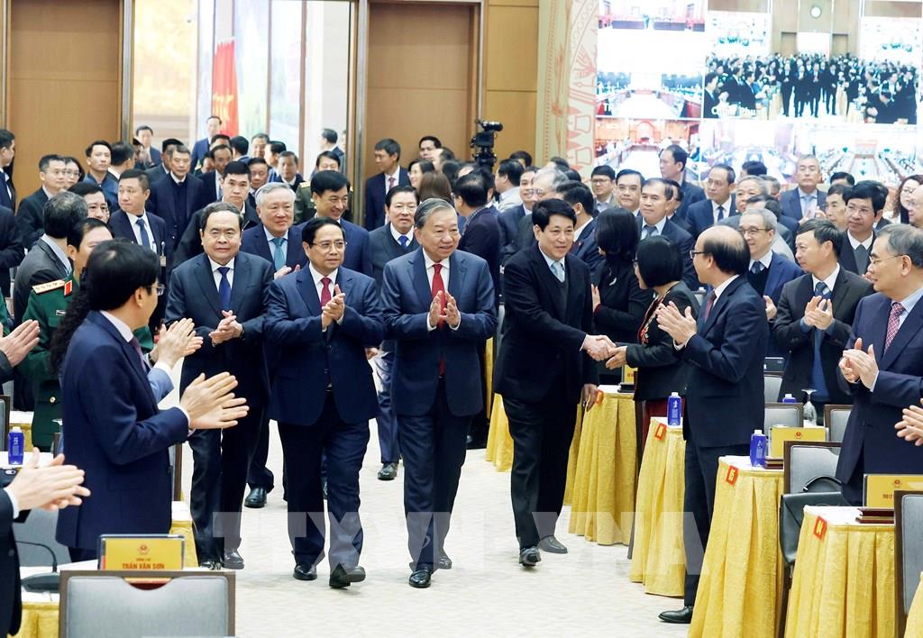 Tổng Bí thư Tô Lâm và các đồng chí lãnh đạo Đảng, Nhà nước dự Hội nghị. Ảnh: Thống Nhất – TTXVN