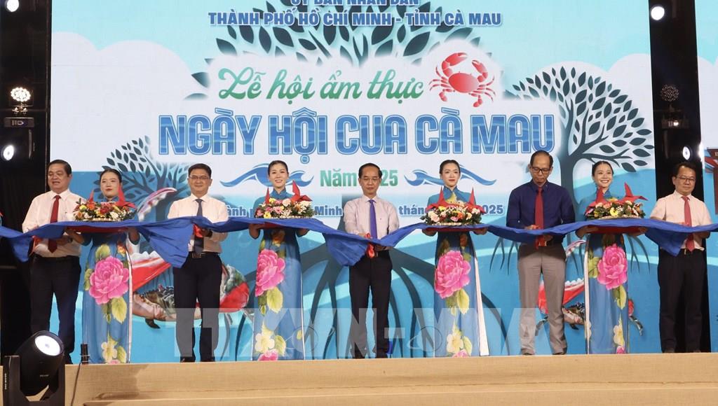 Đại biểu cắt băng khai mạc “Lễ hội Ẩm thực – Ngày hội Cua Cà Mau” năm 2025 tại TP. Hồ Chí Minh. Ảnh: Xuân Anh -TTXVN