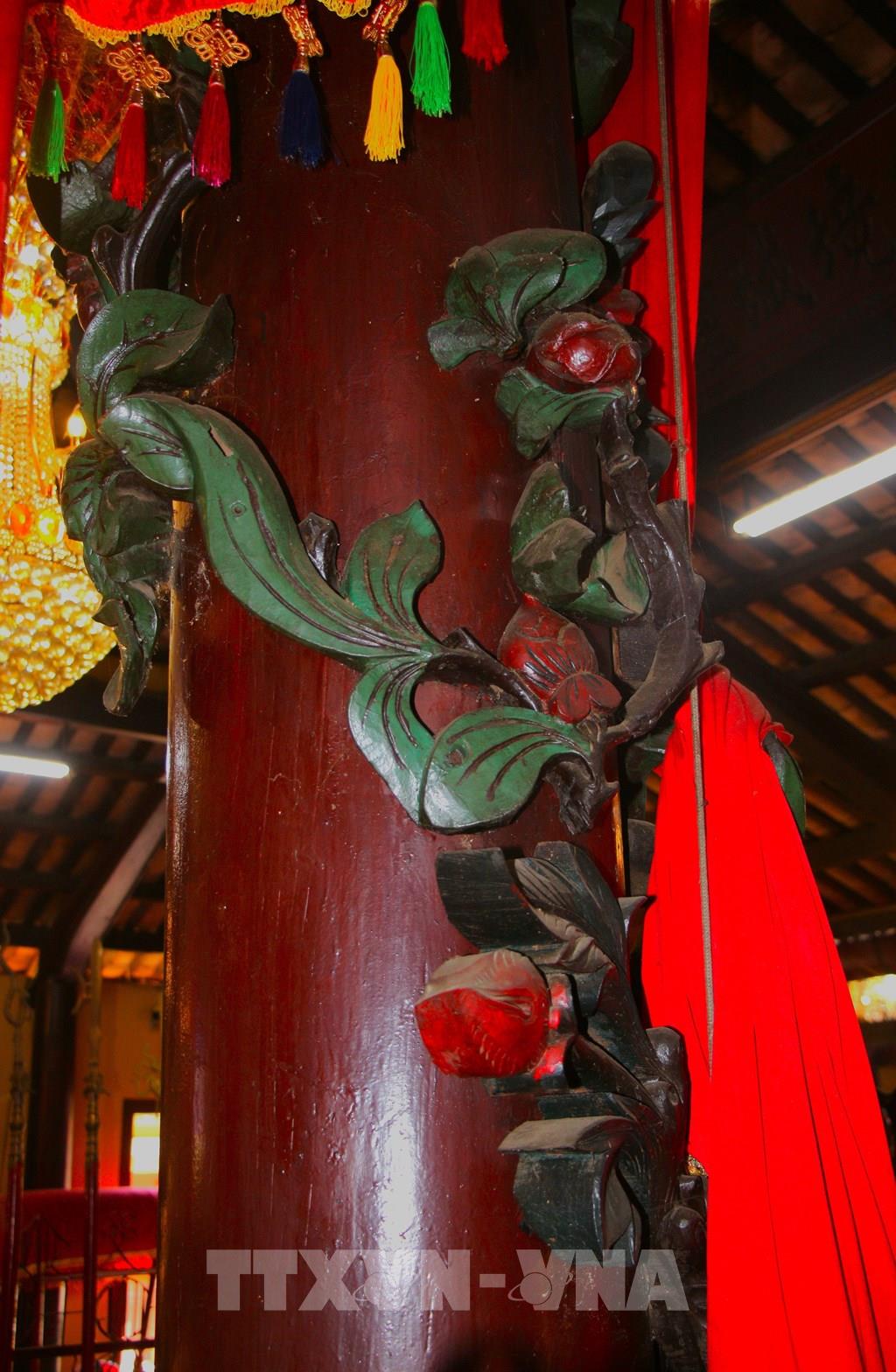 Trên các cột gỗ có họa tiết hình rồng, hoa mẫu đơn được chạm khắc tinh xảo. Ảnh: Nguyễn Hằng – TTXVN
