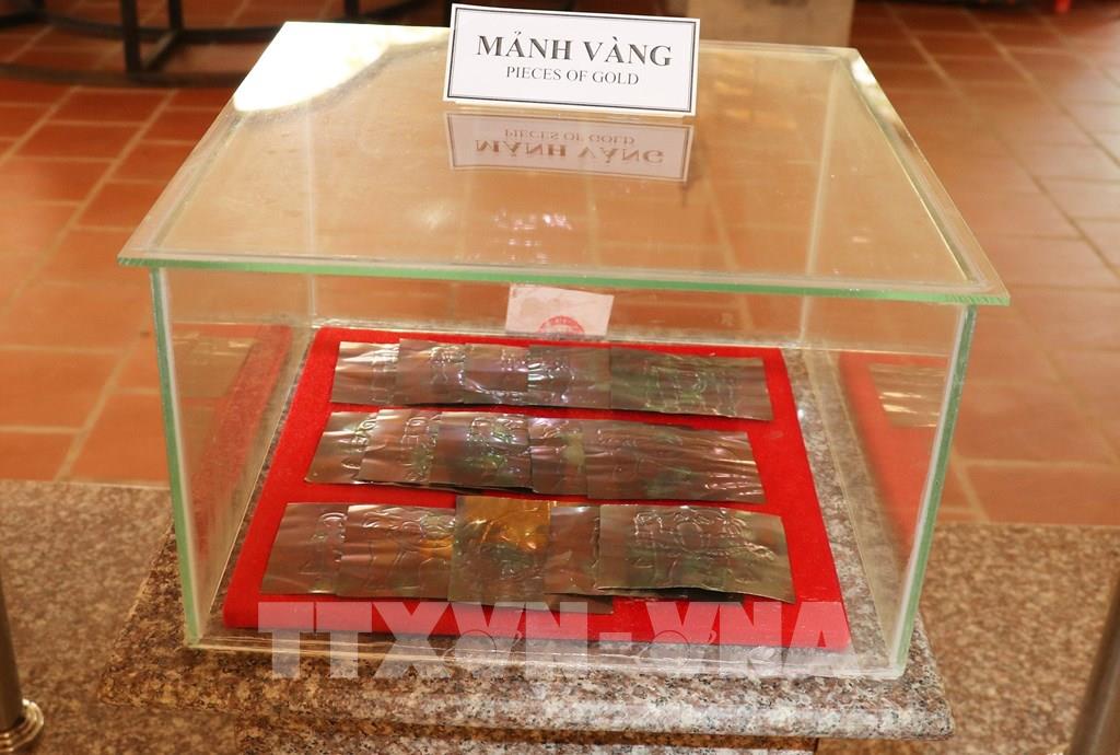 Hiện vật mảnh vàng (phục chế) được trưng bày tại nhà trưng bày di chỉ khảo cổ Gò Thành, xã Tân Thuận Bình, tỉnh Đồng Tháp. Ảnh: Hữu Chí – TTXVN