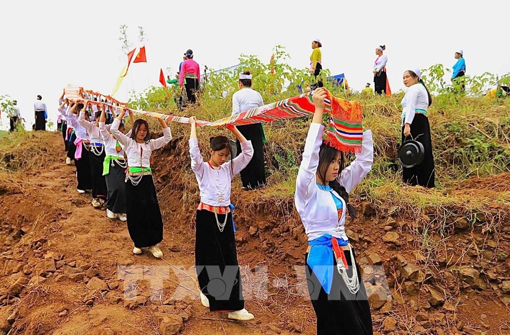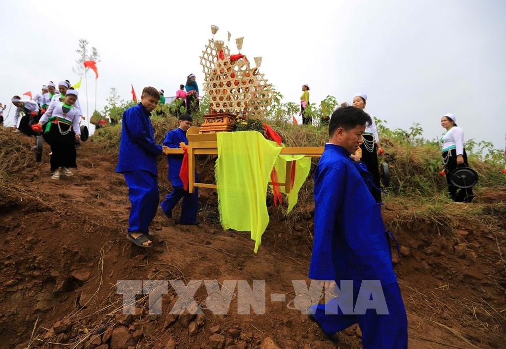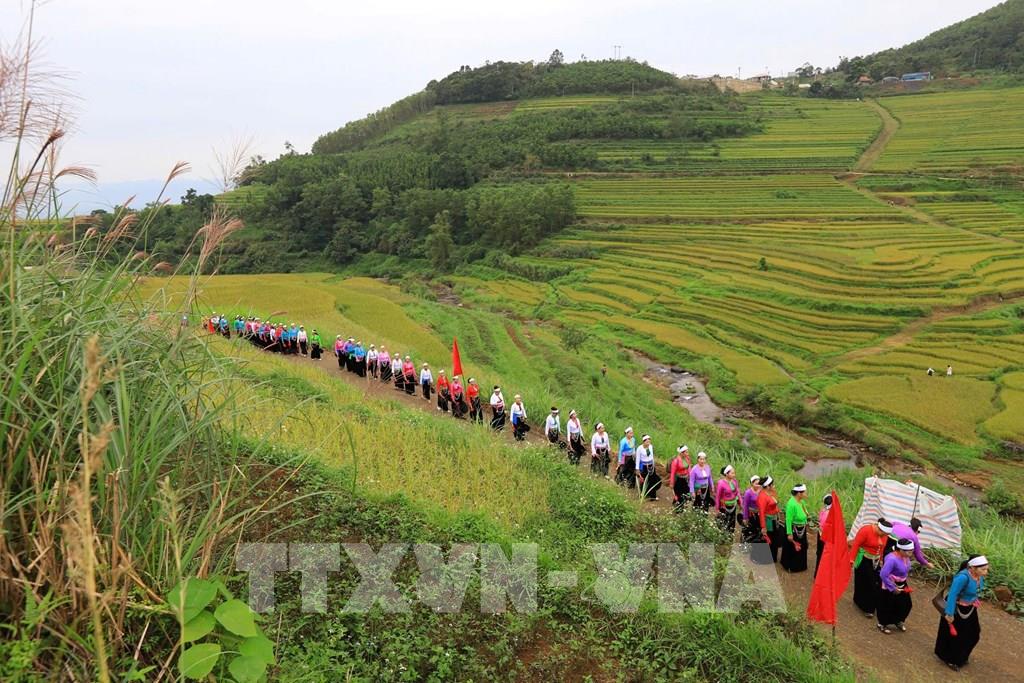 Lễ rước kiệu trên các thửa ruộng bậc thang. Ảnh: Trọng Đạt-TTXVN