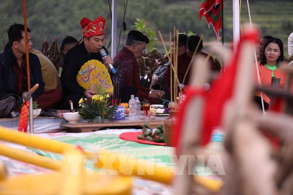 Thầy Mo Bùi Văn Minh thực hiện các nghi thức lễ mừng lúa mới tại lễ hội. Ảnh: Trọng Đạt-TTXVN