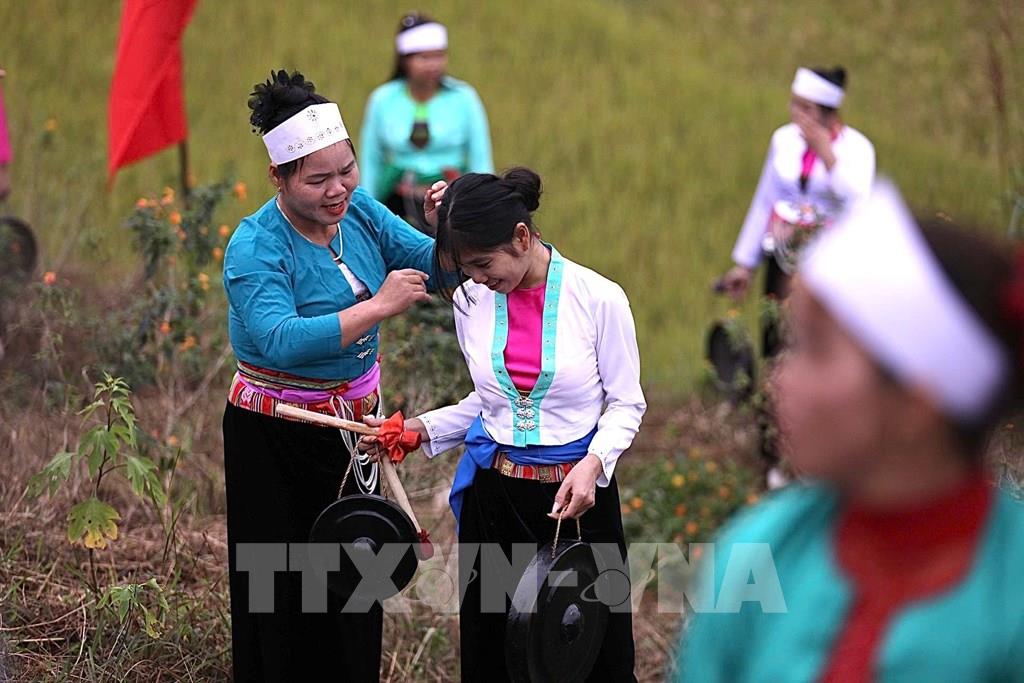 Các nghệ nhân trình diễn chiêng Mương trong lễ hội. Ảnh: Trọng Đạt-TTXVN
