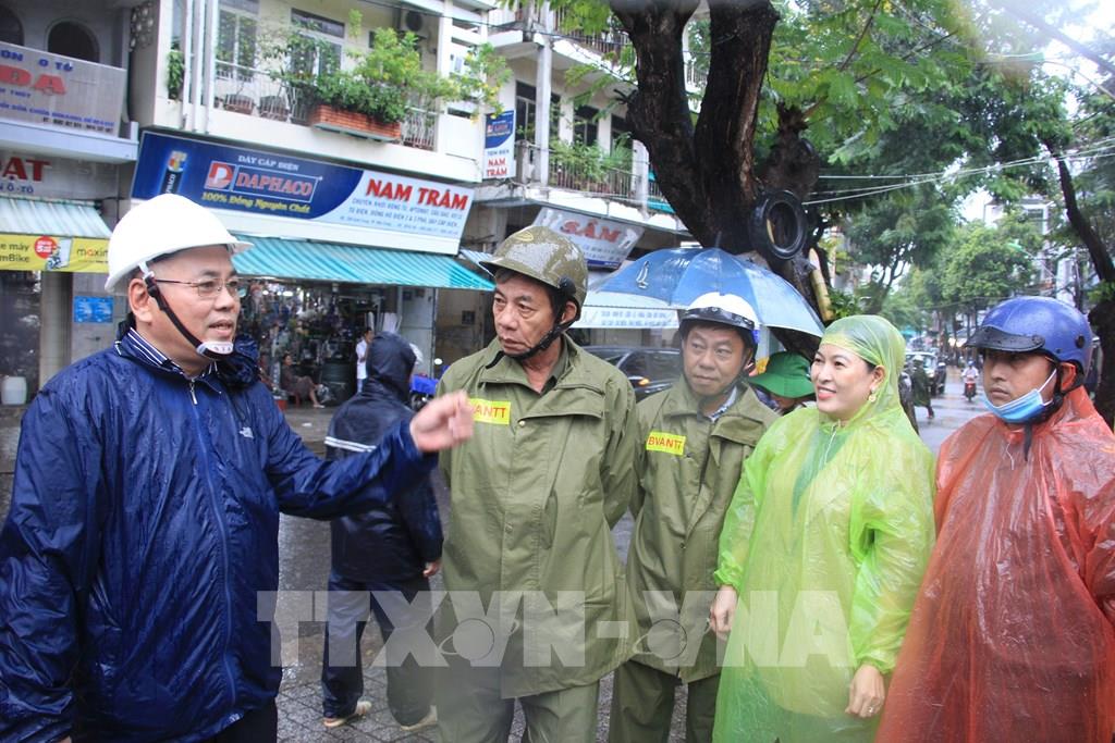 Ông Lê Tiến Vĩnh, Phó Chủ tịch UBND phường Nha Trang, tỉnh Khánh Hòa (bên trái) chỉ đạo kiểm tra các điểm xung yếu ở khu vực Nha Trang trước bão số 13. Ảnh: Phan Sáu - TTXVN