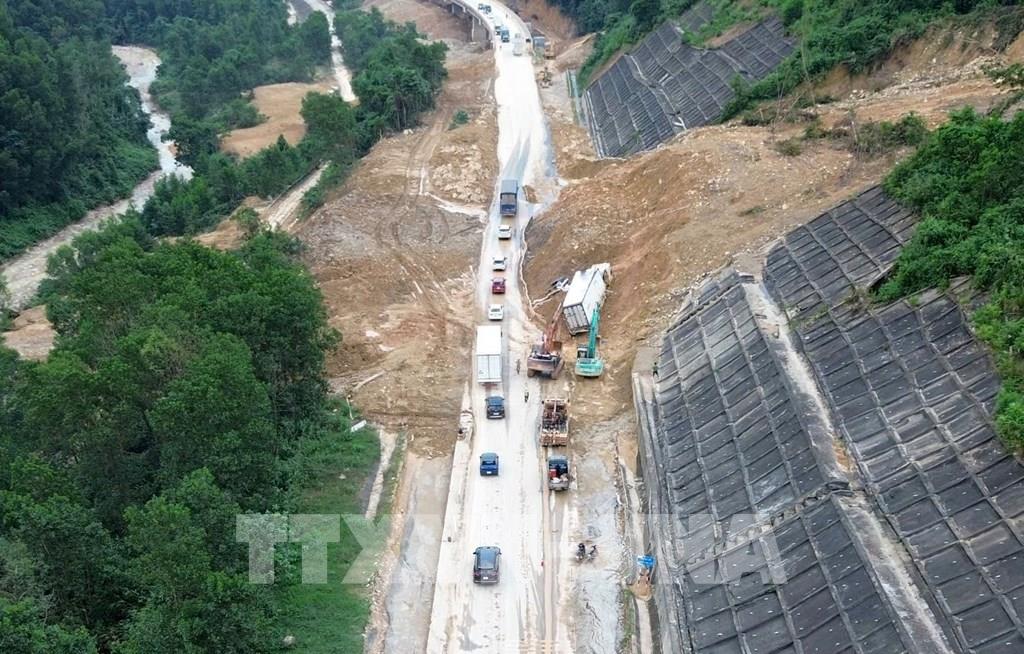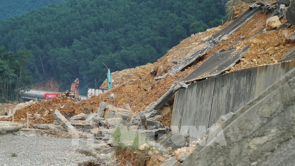 Do mưa lớn trên diện rộng, toàn tuyến đã xảy ra sạt lở mái taluy tại 21 vị trí, khối lượng sạt khoảng 146.000 m3. Ảnh: Quốc Dũng - TTXVN