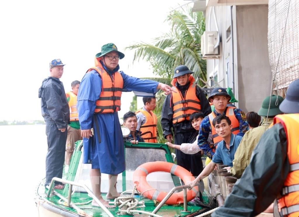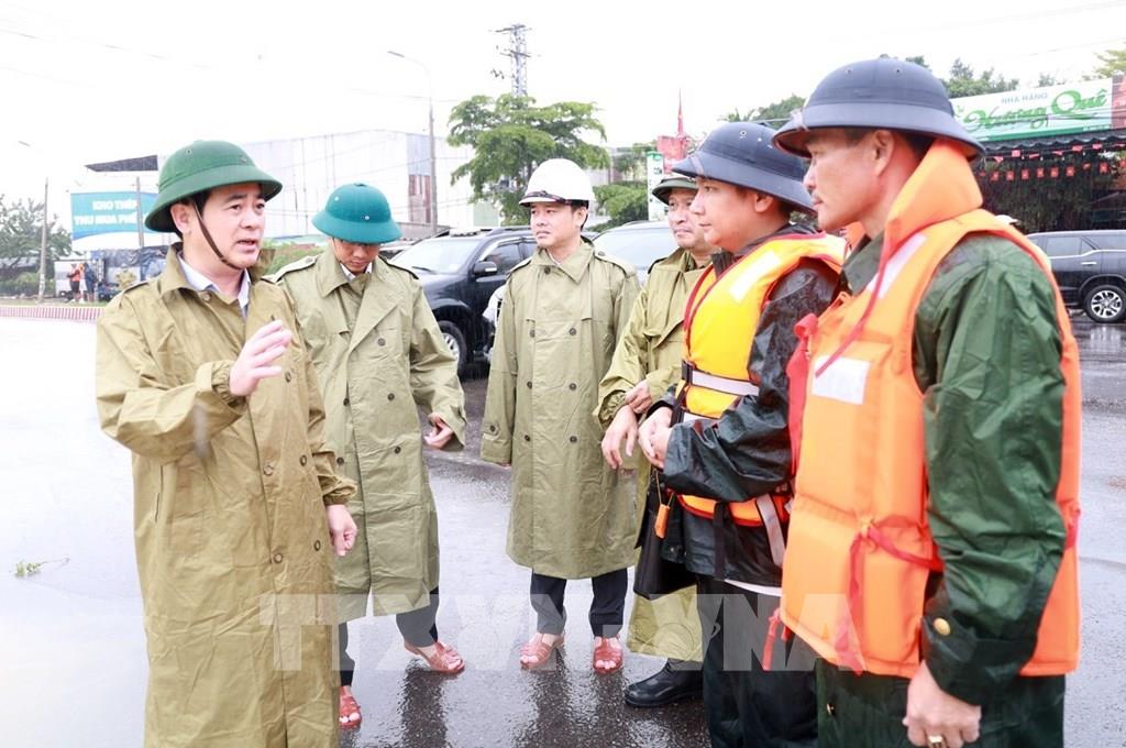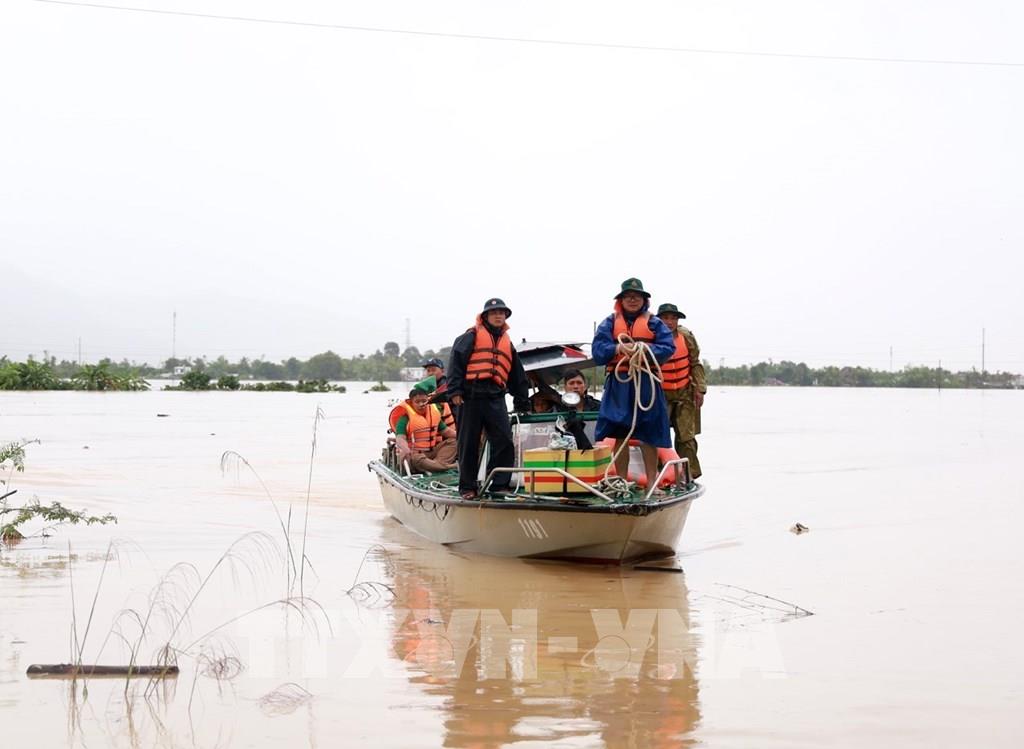 Ông Nghiêm Xuân Thành, Bí thư Tỉnh ủy Khánh Hòa (ngoài cùng bên trái) chỉ đạo công tác ứng cứu người dân khu vực ngập lụt. Ảnh: Xuân Triệu - TTXVN