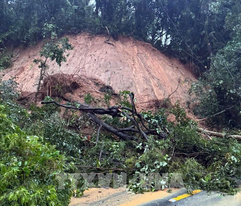 Đất, đá, cây cối sạt lở từ trên núi xuống chắn đường đèo Ngoạn Mục. Ảnh: TTXVN phát