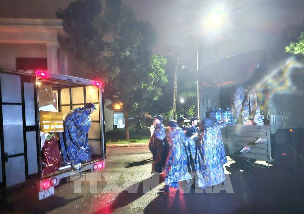 Cán bộ, chiến sĩ hải quân vận chuyển lương thực lên xe để hỗ trợ người dân bị ngập lụt. Ảnh: TTXVN phát