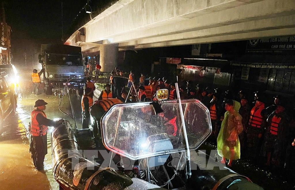 Vùng 4 Hải quân đưa người và phương tiện ứng cứu người dân bị ngập lụt ở phường Tây Nha Trang, tỉnh Khánh Hòa. Ảnh: TTXVN phát