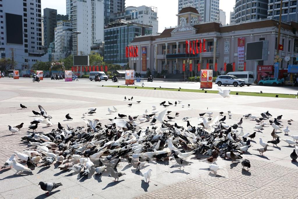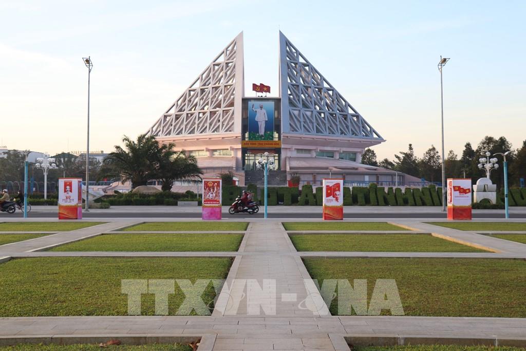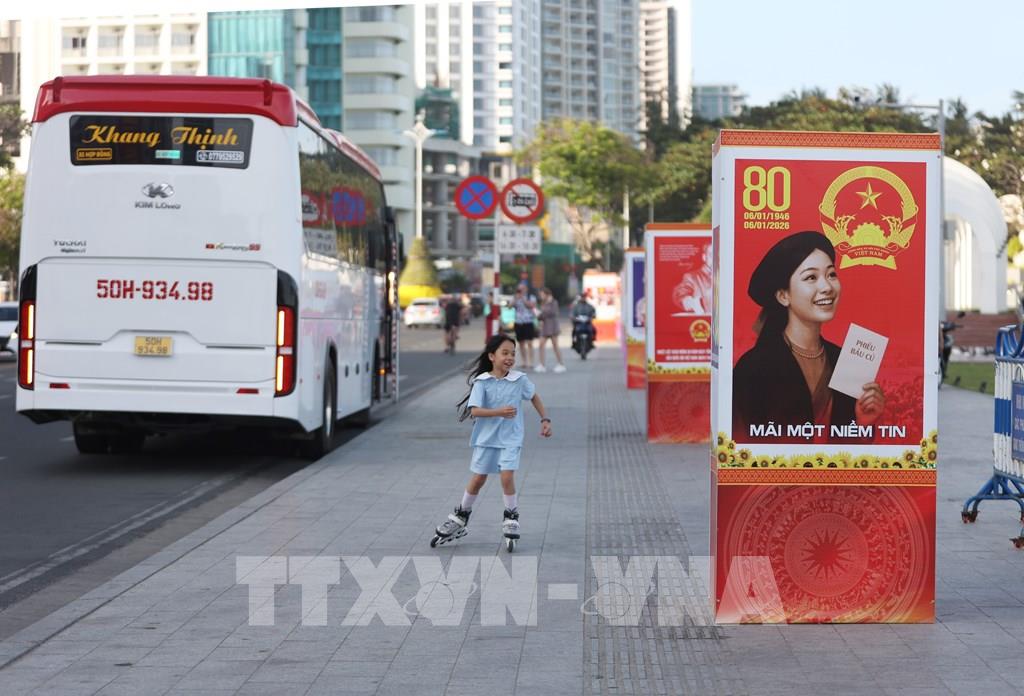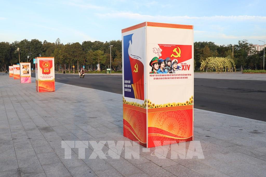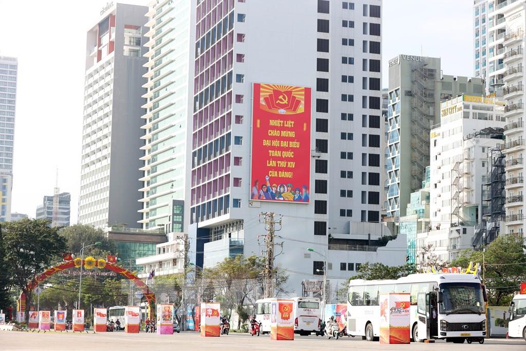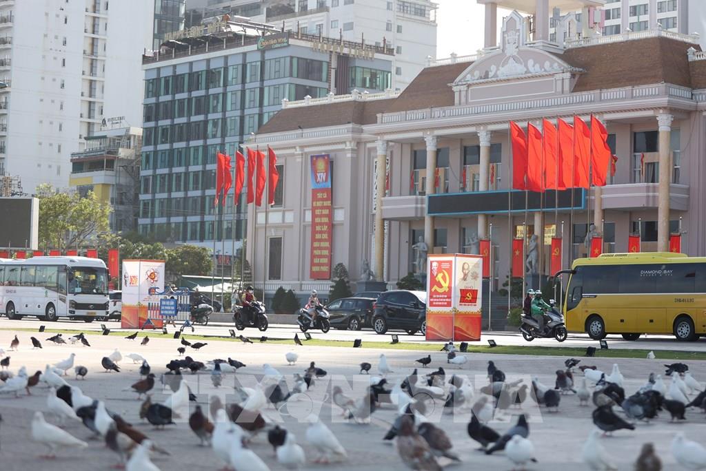 Quảng trường 2 tháng 4, đường Trần Phú (phường Nha Trang) rực đỏ màu cờ và các panô tuyên truyền về Đại hội Đảng. Ảnh Đặng Tuấn -TTXVN
