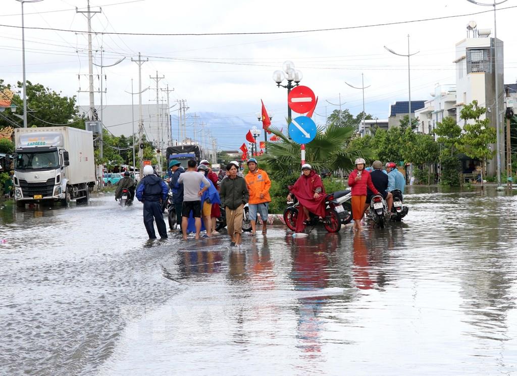 Phương tiện và người dân không thể đi qua tuyến đường Thống nhất về phường Phan Rang và xã Phước Dinh do bị lũ chia cắt sáng 20/11. Ảnh: Công Thử - TTXVN