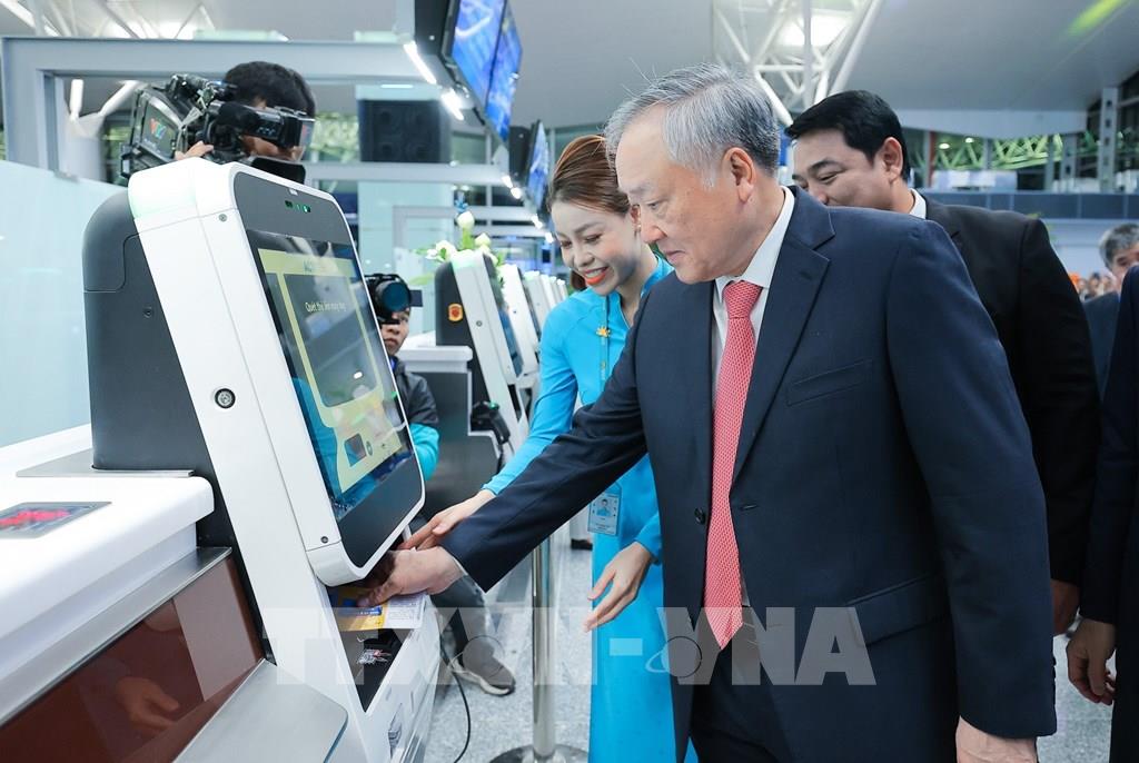 Phó Thủ tướng Thường trực Nguyễn Hòa Bình trải nghiệm sử dụng máy hỗ trợ hành khách tự làm thủ tục ký gửi hành lý tại sân bay (self bag drop). Ảnh: Lê Đông - TTXVN