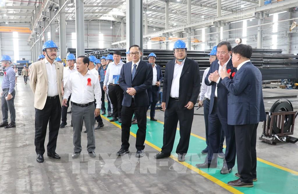 Các đại biểu tham quan Nhà máy sản xuất, kinh doanh sản phẩm thép Hòa Phát Long An. Ảnh: Bùi Giang - TTXVN