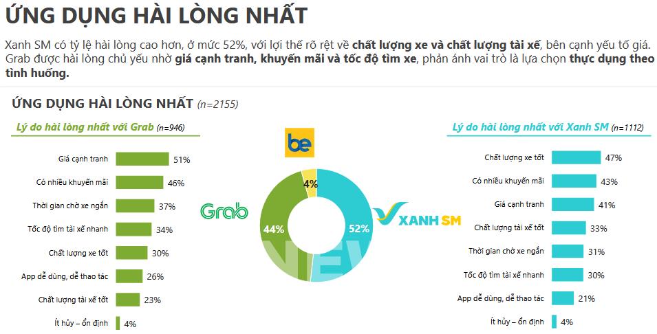 Khi được hỏi về ứng dụng hài lòng nhất, 52% người dùng lựa chọn Xanh SM, so với 44% dành cho Grab. Người dùng đánh giá cao Xanh SM ở chất lượng xe, chất lượng tài xế và mức giá, trong khi Grab được hài lòng chủ yếu nhờ giá cạnh tranh, khuyến mãi và tốc độ tìm xe.