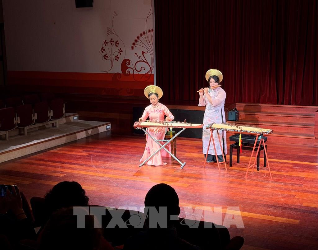 Nghệ sĩ ưu tú Hải Phượng (trái) và nghệ sĩ trẻ Hải Minh biểu diễn tại Bảo tàng Nhạc cụ Brussels. Ảnh: Hương Giang - PV TTXVN tại Bỉ